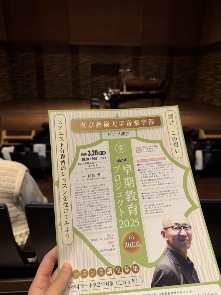 3/20に広島で行われた東京藝術大学の早期教育プロジェクトに小4のTちゃんが最年少で参加させていただきました🌸東京藝術大学の有森博教授のレッスンを受講できる大変貴重な機会に受講生として選抜され、ショパンの前奏曲第15番「雨だれ」を見ていただきました。